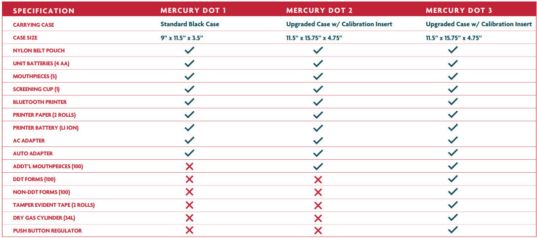 The MERCURY ALCOVISOR® is a NHTSA certified evidential breath testing instrument that offers a high resolution color LCD touch screen and meets or exceeds US DOT specifications for workplace testing. The Mercury-DOT Calibration DOT 3 Kit contains everything you need to perform DOT level workplace alcohol breath testing; from calibrating the instrument to performing/documenting the test. The accurate and easy-to-use Mercury-DOT instrument uses an alcohol specific Platinum Electrochemical fuel cell which produces results quickly on positive and negative samples. The instrument offers both automatic and manual sampling, which along with touch screen technology and its wireless printer, make it an outstanding DOT breath testing device. |